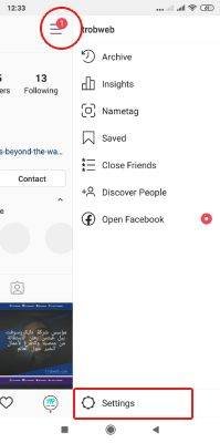 - ادخل إلى واجهة الملف الشخصي في حسابك انستقرام، ثم انقر على خيار الثلاث أشرطة الموجودة في أعلى يمين الشاشة.