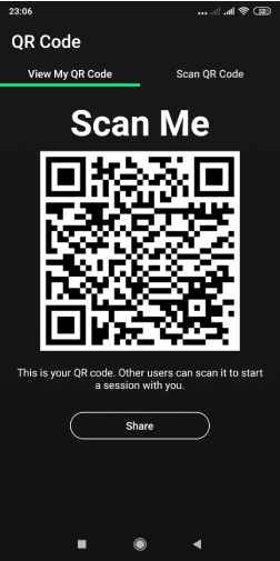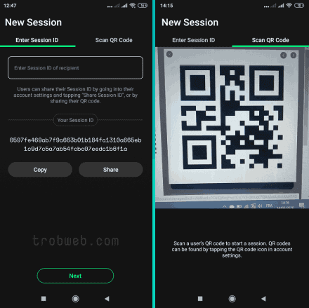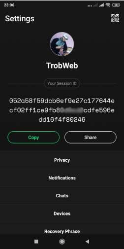- يمكنك إضافة صديق على تطبيق Session والدردشة معه عبر وسيلتين كما سلف الذكر، يجب أن تتوفر على كود ID الخاص بذلك الشخص، أو كود QR. إذا كنت تتوفر على أحد هذين الكودين، انقر على علامة + الموجودة أسفل الواجهة الرئيسية للتطبيق، سوف تجد خيارين الأول خاص بإضافة كود ID، والثاني خاص بعمل scan عبر كاميرا الهاتف لكود QR.