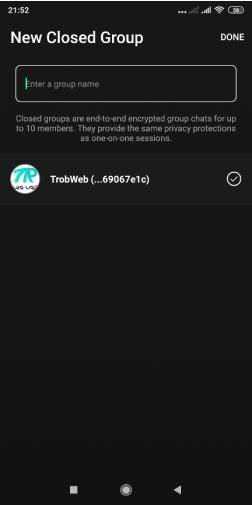 - لعمل مجموعة على Session، انقر على أيقونة تضم شخصين موجودة أعلى واجة التطبيق، بعد ذلك ستظهر لك خانة لإضافة إسم المجموعة مع تحديد الأشخاص المراد إضافتهم إليها.