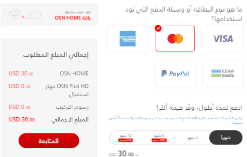 - الآن، قم باختيار وسيلة الدفع مع تحديد عدد الأشهر التي تريد دفعها. بعد ذلك، اضغط على زر “متابعة“.