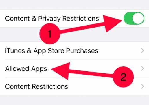 - بعد ذلك، من الممكن أن تجد الخيارات معطلة، لذلك قم بتمكين خيار قيود المحتوى والخصوصية “Content & Privacy Restrictions” من أجل ظهور الخيارات الأخرى. بعد ذلك، اضغط على التطبيقات المسموح بها “Allowed Apps”.