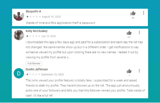 بعد مراجعتنا لبعض الطبيقات، وبناءاً على تعليقات المستخدمين في متجري جوجل بلاي وآب ستور، نجد أن معظمها مزيفة ولا تعمل بالشكل الصحيح كما تدعي، إذ تقوم باختيار أسماء عشوائية وعرضها لك على أنهم من زارو بروفايلك انستقرام. بعض من التطبيقات تطلب منك دفع مبلغ من أجل عرض أكثر من 5 أسماء، ولكن في الحقيقة بعد عرضها لك ما هي إلا مجرد أسماء عشوائية من متابعيك، ناهيك عن ظهور إعلانات بين الحين والآخر.