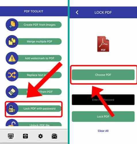 عند فتح التطبيق، سوف تظهر لك جميع خدماته، بما في ذلك إضافة كلمة مرور لملف PDF. انقر على خيار “Lock PDF with Password”، ثم بعدها اضغط على “Choose PDF” من أجل اختيار الملف الذي تريد تعيين له كلمة السر من جهازك.
