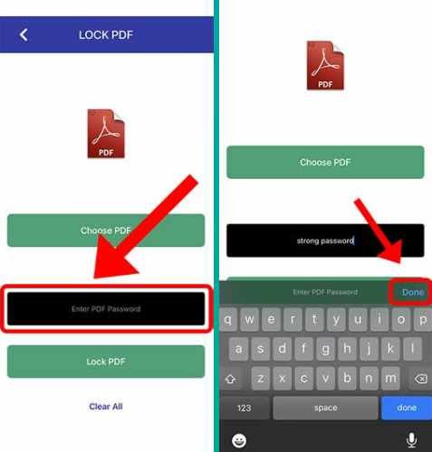 بمجرد تحديد الملف، فإنه لن يعرض معاينة له على التطبيق، فقط قم بإدخال كلمة السر التي تريد تعيينها لملف PDF في الخانة ذات اللون الأسود وانقر على تم “Done”.