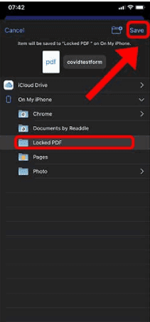 سيُظهر لك التطبيق معانية مقفلة لملف PDF، سوف تحتاج إلى حفظ الملف على الايفون. انقر على أيقونة المشاركة في الجانب العلوي، ثم من قائمة الخيارات، حدد حفظ في الملفات “Save to files”.
