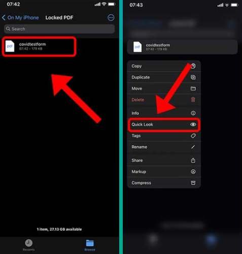 الآن من أجل معاينة والملف والتأكد من عمل القفل، توجه مباشرة إلى الملف المحمي الذي قمت بحفظه للتو. اضغط عليه بشكل مطول، ثم من القائمة المنبثقة حدد خيار نظرة سريعة “Quick Look”