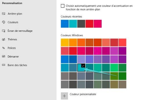 مرر للأسفل إلى قسم اختيار لون التمييز الخاص بك. إذا كنت تريد أن يتم تطابق اللون بشكل تلقائي مع صورة خلفية سطع المكتب، فضع علامة في الخانة التي بجانب خيار اختيار لون تمييز من خلفيتي تلقائيًا “Automatically pick an accent color from my background”. بدلاً من ذلك، انقر على اللون الذي ترغب في استخدامه لقائمة إبدأ وشريط المهام كما هو مبين أسفله. بدلاً من ذلك، يمكنك اختيار لون مخصص عبر النقر على Custom color.