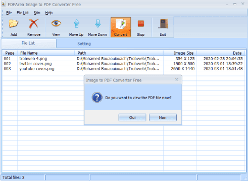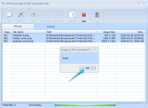 الآن لقد تم إضافة تلك الصور في قائمة الملفات على البرنامج مع ظهور معلومات عن كل صورة، ويشمل ذلك مقاسات الصورة وإسمها، إضافة إلى مسار تخزينها على الكمبيوتر. الأن، ما عليك سوى النقر على زر Convert من أجل تحويل الصور إلى ملف PDF.