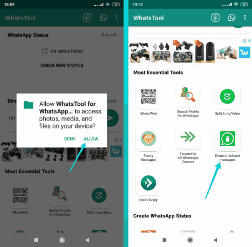 من أجل قراءة الرسائل التي حذفت على واتس اب، سوف نستخدم تطبيق يسمى WhatsTool. إنه تطبيق يتسم بميزات متعددة بغض النظر عن قراءة الرسائل المحذوفة، بما في ذلك تقسيم الفيديو، البحث في البروفايل، الدردشة المباشرة، الوصول لصور الستوري، وغيرها من الخدمات الأخرى. يعمل هذا التطبيق في أي وقت لكشف الرسائل المحذوفة حتى إن كان شاشة الهاتف مقفلة، الحالة الوحيدة التي لن يعمل فيها، عندما لا تكون متصل بالانترنت وتم حذف الرسائل قبل الاتصال بالنت. حسناً، بدون المزيد من اللغط، دعونا نتعرف على كيفية القيام بالعملية.