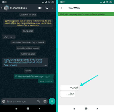 6. انتهينا، من الآن فصاعداً أثناء حذف الرسائل على واتس اب، توجه مباشرة إلى هذا التطبيق وادخل إلى قسم Recover deleted messages، وسوف تجد الدردشة متاحة عناك مع إظهار الرسائل المحذوفة بكل بساطة، ولكن هذا في حالة إن تم حذف الرسائل وأنت متصل بالانترنت، يعني أنك توصلت بالرسالة ثم قام بحذفها المرسل.