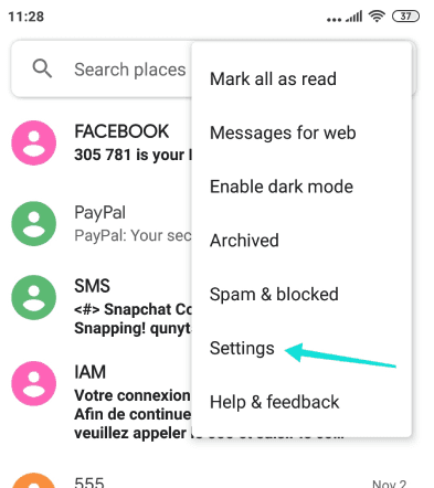 افتح تطبيق الرسائل (Messages) على هاتفك الاندرويد، ثن انقر على الثلاث نقاط العمودية الموجودة في الجانب العلوي على اليمين.