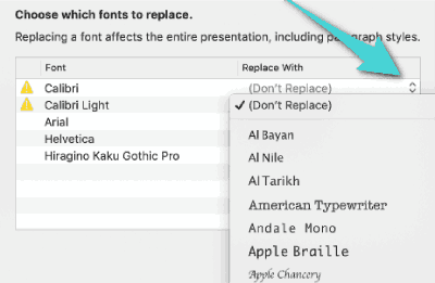 سوف تظهر لك نافذة تسمح لك بحل المشاكل. في هذا المثال، قم باستبدال الخطوط التي بجانبها رمز التنبيه فهي مفقودة وغير مدعومة. انقر على الأسهم الموجودة على يمين كل خط، ثم من القائمة المنسدلة حدد الخط البديل.