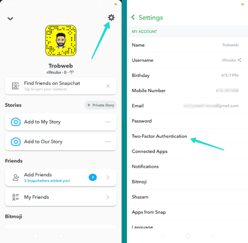 عبر تفعيل ميزة (المصادقة الثنائية) Two-Factor Authentication مع رقم هاتفك، من المستحيل أن يدخل شخص ما إلى حسابك سناب شات، بحيث يتوجب عليه إدخال كلمة المرور لحسابك إضافة إلى رمز التحقق الذي يصل إلى رقم هاتفك بشكل تلقائي عند كل محاولة لتسجيل الدخول.