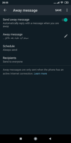 ميزة أخرى جيدة تتيح لك إضافة رسالة معينة تُرْسل بشكل تلقائي لأي شخص قام بإرسال لك رسالة. على سبيل المثال تكتب رسالة تخبرهم بأنك في عطلة حالياً أو لن تكن نشط إلا بعد توقيت معين. كما يمكنك أيظاً أن تضيف رابط لزيارة موقع الويب أو صفحة تضم الأسئلة الشائعة أو أي شيء وفق عملك.