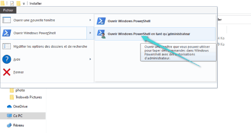 - من نفس النافذة، انقر على قائمة الملف (File) في الشريط العلوي على الجانب، ثم مرر الماوس على خيار Windows PowerShell، ثم بعد ذلك انقر على خيار فتح Windows PowerShell كمسؤول.