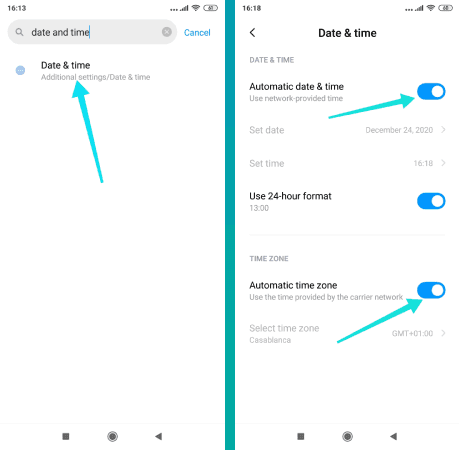 قد يؤدي عدم ضبط الوقت والتاريخ في هاتفك إلى حدوث مثل هذه المشكلات. على الرغم من أن احتمال تعطل متجر جوجل بلاي بسبب الوقت والتاريخ منخفض، إلا أنه في الغالب ما ينتج عنه تعطل تنزيل التطبيقات. لذلك، تأكد من ضبط التاريخ والوقت بالشكل الصحيح في هاتفك.