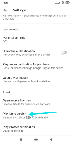 قم بالتمرير إلى الأسفل وانقر على خيار إصدار Play Store. سيؤدي هذا إلى البحث عن آخر إصدار للمتجر إذا لم يتم تحديثه بعد. أما في حالة تعذر فتح تطبيق Google Play على الإطلاق، فيمكنك البحث عن آخر إصدار من المتجر على موقع ApkPure ثم تنزيله وتثبيته.