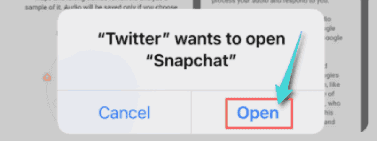 في المرة الأولى التي فيها بهذه العملية، سوف تنبثق رسالة تخبرك بأن تويتر يرغب بفتح تطبيق سناب شات. انقر على خيار فتح (Open) للسماح بذلك.