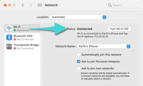 أما على نظام الماك، انقر على زر Wi-Fi في شريط القائمة، ثم مباشرة اضغط على خيار تفضيلات الشبكة “Network Preferences”. في الواجهة التالية، تأكد من حالة اتصالك بالانترنت.