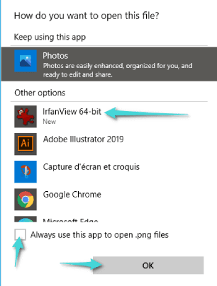 بعد التثبيت، قم بفتح أي صورة على جهازك وسوف تظهر لك نافذة لاختيار برنامج فتح الصورة، حدد Irfanview ثم انقر على Ok لفتح الصورة عليه. (إذا كنت تريد جعل البرنامج افتراضي لفتح عليه أي صورة نقرت عليها، حدد المربع بجانب خيار استخدام دائما هذا البرنامج لفتح ملف [صيغة الصورة] “Always use this app to open [format photo] file”).