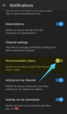 ملاحظة : في حالة عدم ظهور إعدادات الإشعارات على تطبيق Youtube، فهذا يعني أنك قمت بتعطيل إشعارات يوتيوب من خلال إعدادات الهاتف. لتمكينه، ادخل إلى الإعدادات > الإشعارات > Youtube ، ثم قم بتمكين زر الإشعارات. بعد تطبيق هذه الخطوات، سوف يظهر لك خيار تمكين أو تعطيل الفيديوهات الموصى بها أو المقترحة على إعدادات يوتيوب.