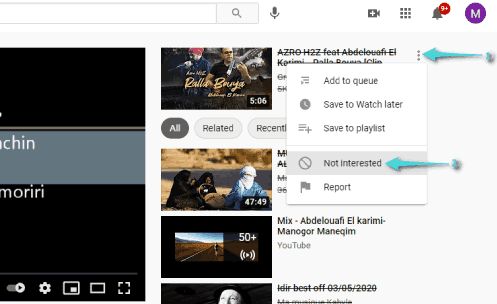 طبعاً في أي وقت ظهر لك فيديو مقترح غير مناسب لك وتريد عدم إظهاره مجدداً، مرر الماوس عليه انقر على خيار الثلاث نقاط الموجودة بجانبه، ثم حدد غير مهتم “Not interested” ضمن القائمة التي ظهرت.