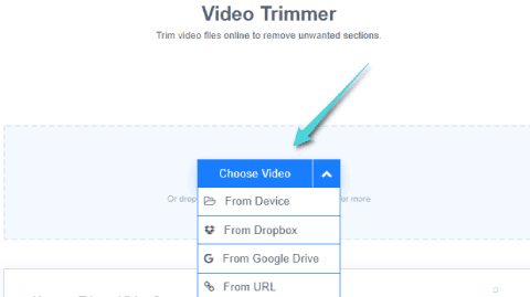 انقر على زر اختيار فيديو “Choose Video” ثم حدد الفيديو المراد قصه من النافذة التي ظهرت. بدلاً من ذلك، انقر على السهم المجاور ثم اختر عما إذا كنت تريد اختيار فيديو من جوجل درايف أو دروبوكس، أو ضع رابط URL الخاص بك.