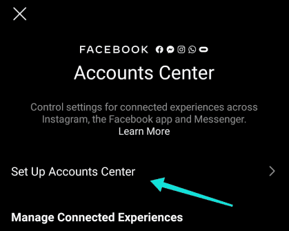 مرر للأسفل وانقر على خيار مركز الحسابات “Accounts Center” باللون الأزرق.