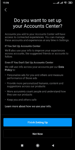 ضع في اعتبارك أن عملية الربط هذه تتيح لك إمكانية نشر المحتوى والوصول إلى ميزات فيسبوك الأخرى، مثل الدردشة الفورية من إنستقرام إلى ماسنجر. أيظاً عند القيام بهذه الخطوة فإنك تسمح لفيسبوك من الوصول لبياناتك إنستقرام من أجل استخدامها لأغراض الإعلانات. إذا كنت موافق على ذلك، فانقر على زر إنهاء الإعداد “Finish Setting Up”.