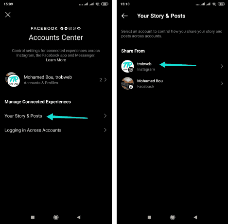 ارجع إلى مركز الحسابات، ثم اضغط على قسم قصتك ومنشوراتك “Your Story and Posts”. حدد حسابك إنستقرام.