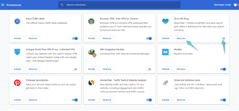 سوف تظهر لك جميع الإضافات، قم بتعطيلها عبر الزر الموجود في الزاوية السفلية لكل إضافة، أو يمكنك إزالتها من المتصفح عبر النقر على زر إزالة “Remove”.