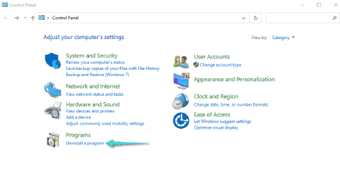 سوف تُفتح نافذة لوحة التحكم، اضغط على خيار إلغاء تثبيت برنامج “Uninstall a program”.