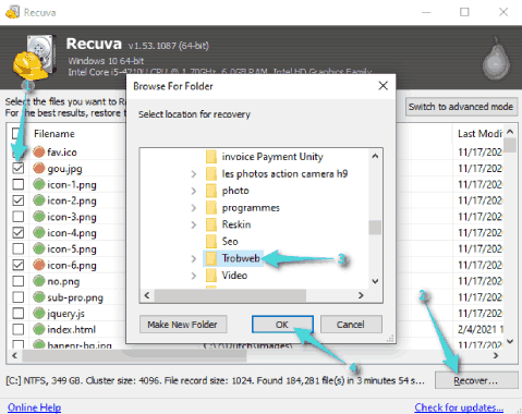 بعد الانتهاء من تحديد ما تريد استعادته، انقر على زر استرداد “Recover”، ثم حدد مسار حفظ تلك الملفات على جهازك ضمن النافذة المنبثقة وانقر على زر موافق “OK” (لا تقم باستعادة الملفات على نفس القرص الصلب التي حذفت منها، قم بتحديد مسار حفظ ضمن قرص صلب آخر ).
