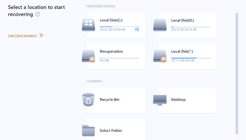 في الصفحة التالية، حدد القرص الصلب الذي كان يحتوي على الملفات المحذوفة. بإمكان لهذا البرنامج استرجاع الملفات المحذوفة من مختلف أنواع الأقراص الصلبة، بما في ذلك HDD و SDD، ذاكرة SD، فلاشة USB، وغيرها.