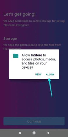 - الآن، افتح تطبيق Downloader Instore (في المرة الأولى التي تستخدم فيها التطبيق، سوف يطلب منك منح صلاحيات التخزين في هاتفك، لذلك بعد الضغط على زر متابعة، انقر على خيار السماح “Allow” في النافذة المنبقة الصغيرة).