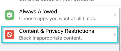 في الصفحة التالية، انقر على خيار قيود المحتوى والخصوصية “Content & Privacy Restrictions”.