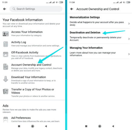في الصفحة التالية، مرر للأسفل إلى قسم معلوماتك على فيسبوك، ثم انقر على خيار ملكية الحساب والتحكم فيه “Account ownership and control”. بعد ذلك مباشرة اضغط على خيار إلغاء التنشيط والحذف “Deactivation and deletion”.