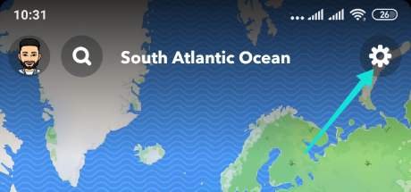 بعد ذلك، سوف نحتاج للدخول إلى إعدادات SnapMap، ويمكنك القيام بذلك عبر النقر على رمز الترس الذي يظهر في الجانب العلوي. (إذا لم تقم بتمكين مشاركة موقعك على الخريطة، فسيطلب منك ذلك في النافذة المنبثقة الصغيرة).