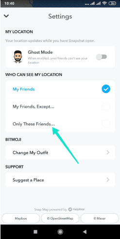 تتيح لك صفحة إعدادات خريطة سناب اختيار من يمكنه رؤية موقعك الجغرافي على الخريطة. من الممكن أنه تم تعيين هذا الخيار بشكل افتراضي على أصدقائي “My Friends” أو وضع الشبح “Ghost Mode”. لذلك، إذا تم تعيينه على هذا الأخير، فقم بتعطيله عبر الزر الموجود بجانبه.
