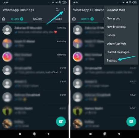 افتح تطبيق Whatsapp الخاص بك ثم انقر على خيار الثلاث نقاط الموجودة في الزاوية العلوية. من القائمة التي ظهرت، حدد الإعدادات “Setting”. (على الايفون انقر على الإعدادات التي تظهر كعلامة تبويب في الأسفل).