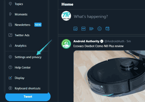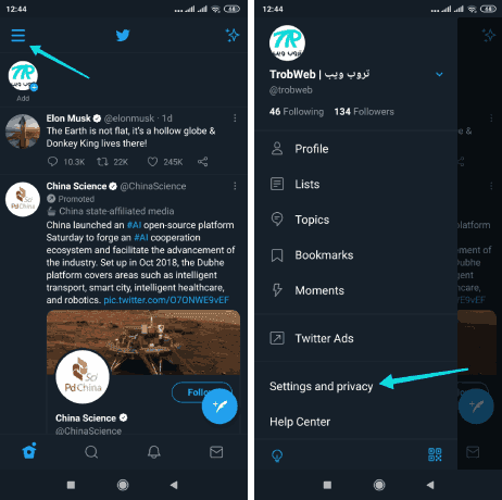 افتح تطبيق Twitter على جهازك ثم سجل الدخول إلى حسابك. بمجرد القيام بذلك، انقر على خيار الثلاث أشرطة في الجانب العلوي، ثم من القائمة الجانبية التي ظهرت، اضغط على خيار الإعدادات والخصوصية “Settings and privacy”.