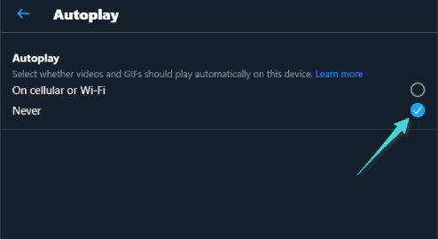 قم بتحديد خيار مطلقاً “Never” لكي يتم تعطيل التشغيل التلقائي للفيديوهات على حسابك تويتر.