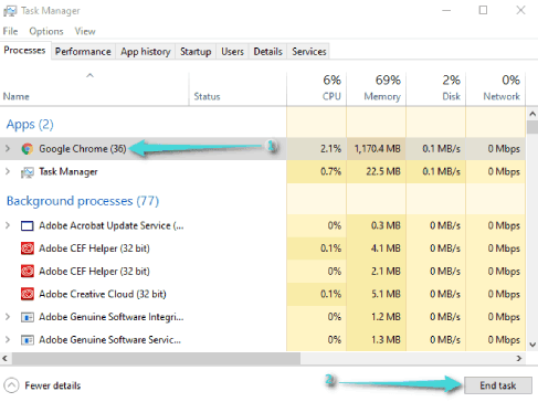 - إذا لاحظت استخدام مبالغ فيه للمعالج بواسطة أحد البرامج، فانقر فوق اسم البرنامج ثم حدد خيار إنهاء المهمة “End task” الموجود في الجانب السفلي.