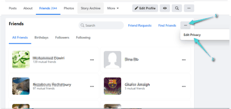 في الجانب العلوي من قائمة الأصدقاء التي ظهرت، انقر على خيار الثلاث نقاط ثم حدد تعديل الخصوصية “Edit Privacy”.