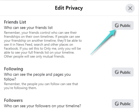 سوف تنبثق قائمة لتحديد من يمكنه رؤية قائمة أصدقاءك. بشكل افتراضي سوف تجدها محددة على عام “Public”. انقر على هذا الأخير الذي يظهر بجانب خيار قائمة الأصدقاء “Friends List”، وسوف تنبثق قائمة أخرى لتحديد من خلالها من يمكنه رؤية قائمة أصدقاءك.