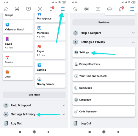 انقر على خيار الثلاث أشرطة الموجودة في الجانب العلوي، ثم بعد ذلك مرر للأسفل وحدد خيار الإعدادات والخصوصية “Settings & Privacy”. ضمن القائمة الفرعية التي ظهرت، انقر على الإعدادات “Settings”.