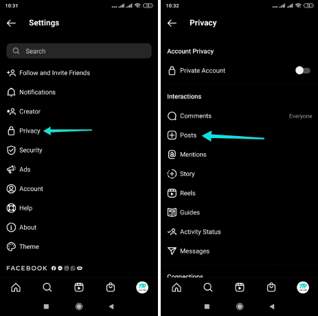 ضمن صفحة الإعدادات، انقر على خيار الخصوصية “Privacy”. بعد ذلك، انقر على خيار المنشورات “Posts”.