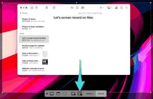 الخيار الأول هو لتسجيل شاشة الماك كاملة، في حين أن الخيار الثاني هو لتحديد جزء من الشاشة وتسجيله. يمكنك النقر عليه، ثم اسحب النقاط وفق ما ترغب لتحديد جزء الشاشة الذي تريد تصوير فيديو له.
