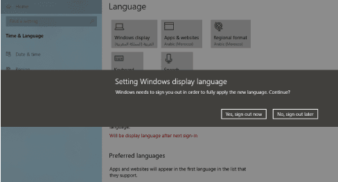 بمجرد تحديد اللغة الجديد، سوف يظهر لك إشعار يطلب منك إعادة تشغيل الجهاز من أجل تطبيق تعريب ويندوز 10، يمكنك الموافقة على ذلك عبر النعر على خيار نعم، تسجيل الخروج الآن “Yes, sign out now” أو تأجيل تطبيق تلك الإعدادات حتى تقوم بإعادة تشغيل الجهاز بنفسك لاحقاً، وذلك عبر النقر على خيار لا، تسجيل الخروج لاحقا “No, sign out later”.