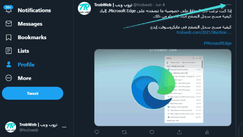 توجه مباشرة إلى التغريدة التي تريد تثبيتها، ثم انقر على خيار الثلاث نقاط الموجودة بجانبها.